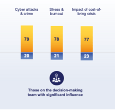 The global report reveals that 78 per cent of respondents who are on the decision-making team with significant influence consider cyber attacks and online crimes, as well as work stress and burnout, tops the list of risks perceived within the workforce. 75% reported to be impacted by the growing cost of living, followed by mental health concerns noted at 70 per cent, requiring businesses in the UAE to reassess how they safeguard workforce wellbeing.